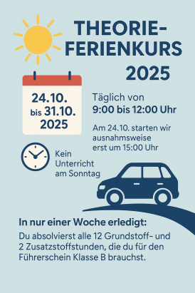 Theorieunterricht: Montag & Mittwoch, 18:30–20:00 Uhr, Bonländer Hauptstraße 32/1